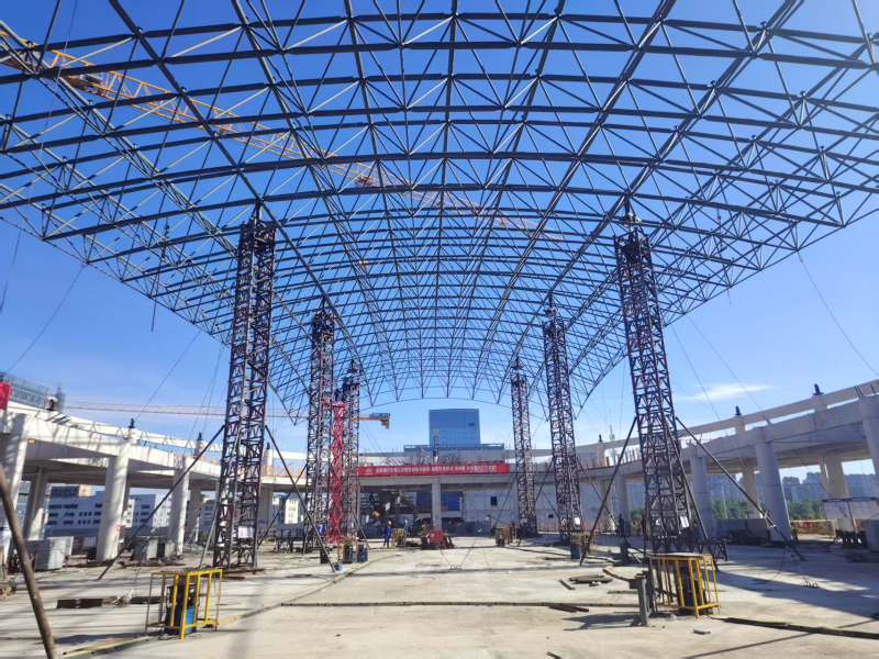技術(shù)創(chuàng)新:首創(chuàng)“分區(qū)分級(jí)同步頂升,高空散裝接力”工藝,解決了大跨度網(wǎng)架頂升同步性與穩(wěn)定性控制的技術(shù)難點(diǎn);